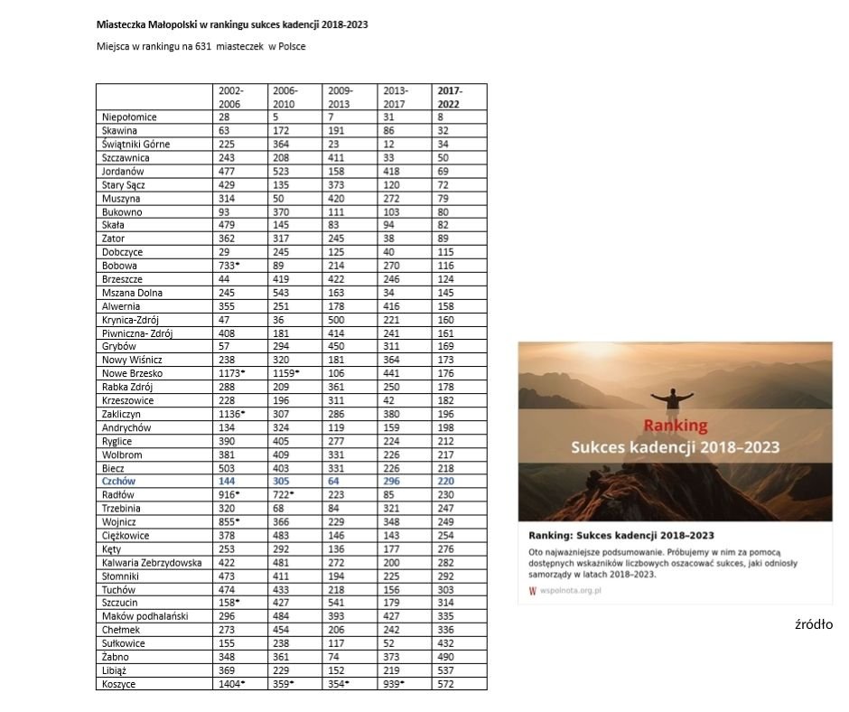 W ostatnich dniach obecne władze rozpowszechniają fragmenty jednego z rankingów, które mają sprawiać wrażenie, że Czchów od lat zajmował bardzo słabe pozycje. Tymczasem pełne dane pokazują coś zupełnie innego – nasza gmina wielokrotnie znajdowała się w ścisłej czołówce miasteczek w Polsce.