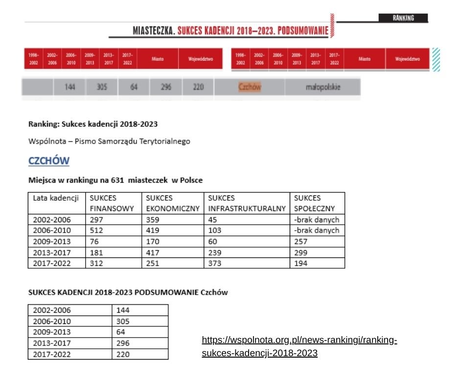 Ranking „Sukces kadencji 2018–2023” – pismo „Wspólnota” To prestiżowe i uznane zestawienie oparte na twardych danych GUS i wskaźnikach finansowych. I właśnie w tym rankingu Czchów zajmował bardzo dobre miejsca w poprzednich latach: